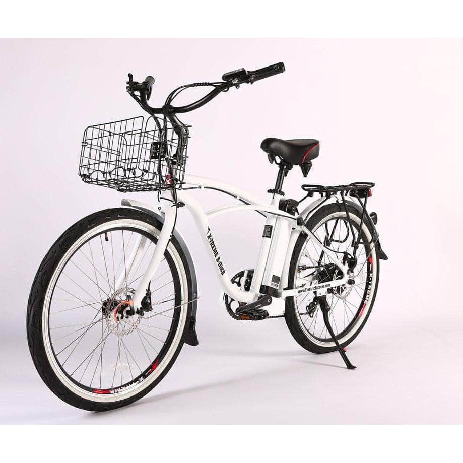This awesome electric beach cruiser bicycle comes standard with a folding basket that can be hung on either the front handlebars or on either side of the rear rack. There is no extra fee for the basket!